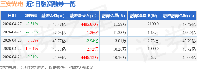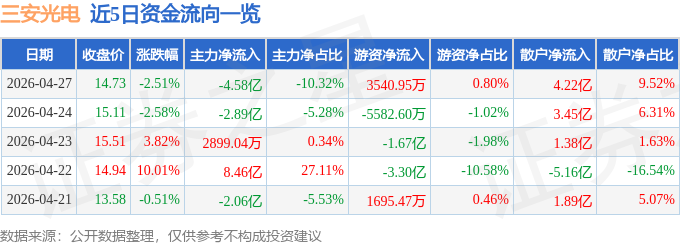证券之星消息,截至2026年4月27日收盘,三安光电(600703)报收于14.73元,下跌2.51%,换手率6.0%,成交量299.42万手,成交额44.36亿元。