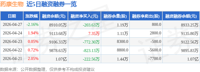 证券之星消息,截至2026年4月27日收盘,药康生物(688046)报收于19.5元,下跌2.16%,换手率2.3%,成交量9.43万手,成交额1.84亿元。