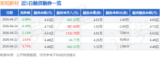 证券之星消息,截至2026年4月27日收盘,宏柏新材(605366)报收于13.19元,下跌2.08%,换手率3.94%,成交量30.58万手,成交额3.99亿元。