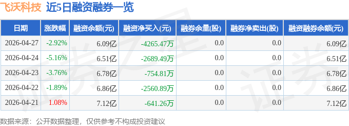 飞沃科技融资融券信息显示,融资方面,当日融资买入9810.1万元,融资偿还1.41亿元,融资净偿还4265.47万元。融券方面,融券卖出0.0股,融券偿还0.0股,融券余量0.0股,融券余额0.0万元。融资融券余额6.09亿元。