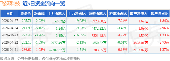 证券之星消息,截至2026年4月27日收盘,飞沃科技(301232)报收于205.71元,下跌2.92%,换手率14.8%,成交量6.61万手,成交额13.71亿元。