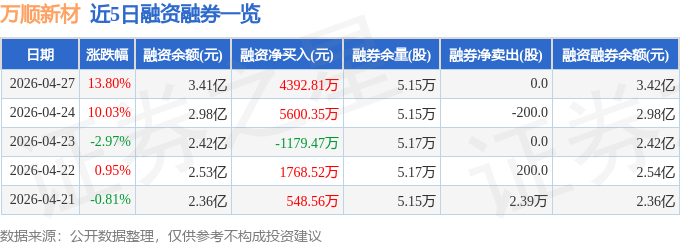 证券之星消息,截至2026年4月27日收盘,万顺新材(300057)报收于8.99元,上涨13.8%,换手率26.56%,成交量202.83万手,成交额17.25亿元。