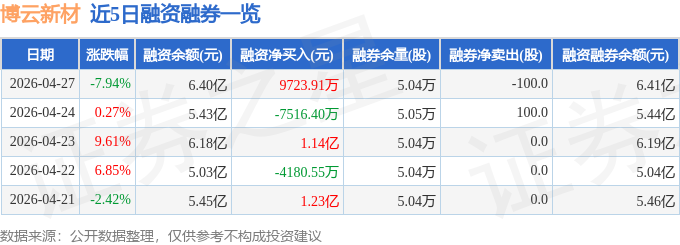 博云新材融资融券信息显示,融资方面,当日融资买入3.93亿元,融资偿还2.96亿元,融资净买入9723.91万元。融券方面,融券卖出0.0股,融券偿还100.0股,融券余量5.04万股,融券余额103.47万元。融资融券余额6.41亿元。