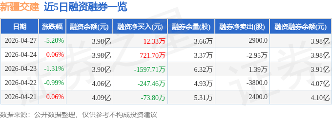 证券之星消息,截至2026年4月27日收盘,新疆交建(002941)报收于14.96元,下跌5.2%,换手率3.35%,成交量24.48万手,成交额3.69亿元。