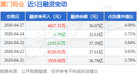 证券之星消息,4月27日,厦门钨业(600549)融资买入7.12亿元,融资偿还6.65亿元,融资净买入4657.31万元,融资余额36.07亿元,近20个交易日中有13个交易日出现融资净买入。
