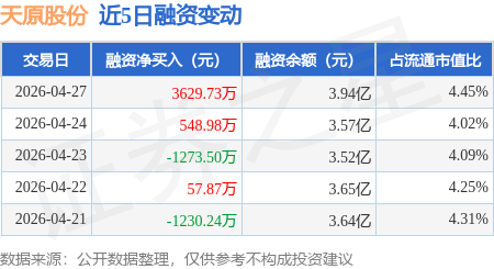 证券之星消息,4月27日,天原股份(002386)融资买入8804.7万元,融资偿还5174.97万元,融资净买入3629.73万元,融资余额3.94亿元,近20个交易日中有15个交易日出现融资净买入。