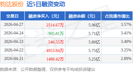 证券之星消息,4月27日,钧达股份(002865)融资买入8636.72万元,融资偿还6122.05万元,融资净买入2514.67万元,融资余额5.96亿元,近20个交易日中有11个交易日出现融资净买入。