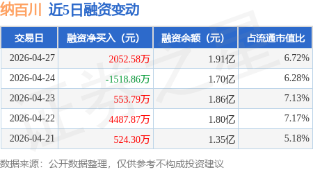 证券之星消息,4月27日,纳百川(301667)融资买入1.0亿元,融资偿还7991.21万元,融资净买入2052.58万元,融资余额1.91亿元,近20个交易日中有11个交易日出现融资净买入。