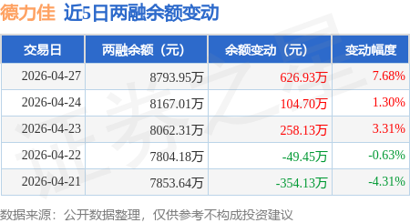 证券之星消息,4月27日,德力佳(603092)融资买入2026.99万元,融资偿还1400.05万元,融资净买入626.93万元,融资余额8793.95万元,近3个交易日已连续净买入累计989.76万元。