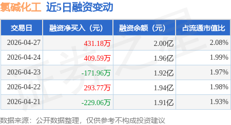 证券之星消息,4月27日,氯碱化工(600618)融资买入1680.37万元,融资偿还1249.19万元,融资净买入431.18万元,融资余额2.0亿元。