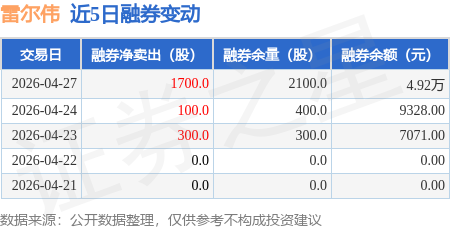 融券方面,当日融券卖出1700.0股,融券偿还0.0股,融券净卖出1700.0股,融券余量2100.0股,近3个交易日已连续净卖出累计2100.0股。