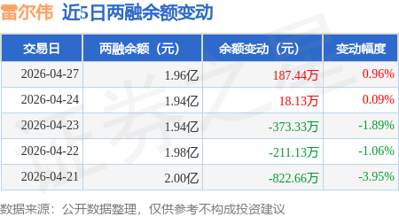 证券之星消息,4月27日,雷尔伟(301016)融资买入819.02万元,融资偿还635.57万元,融资净买入183.45万元,融资余额1.96亿元,近20个交易日中有11个交易日出现融资净买入。