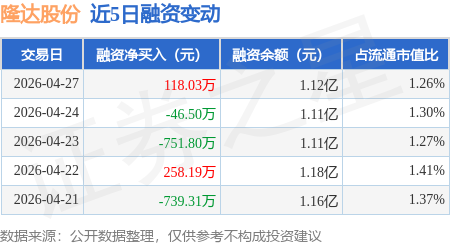 证券之星消息,4月27日,隆达股份(688231)融资买入885.23万元,融资偿还767.21万元,融资净买入118.03万元,融资余额1.12亿元。