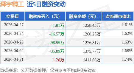 证券之星消息,4月27日,舜宇精工(920906)融资买入7.95万元,融资偿还9.77万元,融资净卖出1.81万元,融资余额1258.43万元。