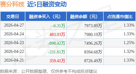 证券之星消息,4月27日,赛分科技(688758)融资买入780.08万元,融资偿还786.39万元,融资净卖出6.31万元,融资余额7973.89万元。