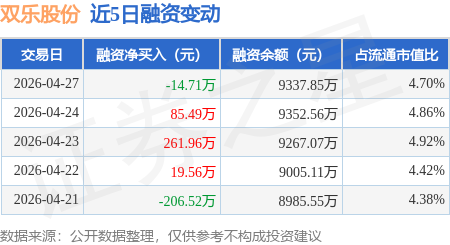 证券之星消息,4月27日,双乐股份(301036)融资买入625.06万元,融资偿还639.77万元,融资净卖出14.71万元,融资余额9337.85万元。