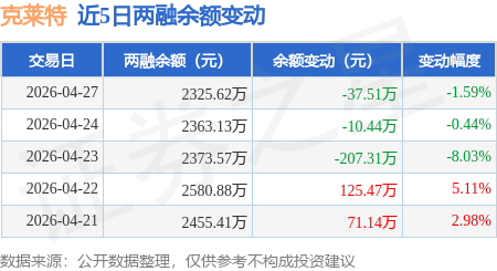 证券之星消息,4月27日,克莱特(920689)融资买入158.24万元,融资偿还195.75万元,融资净卖出37.51万元,融资余额2325.62万元。
