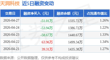 证券之星消息,4月27日,天润科技(920564)融资买入79.67万元,融资偿还130.67万元,融资净卖出51.01万元,融资余额1335.72万元。