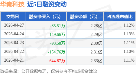 证券之星消息,4月27日,华秦科技(688281)融资买入812.44万元,融资偿还897.95万元,融资净卖出85.51万元,融资余额2.28亿元。