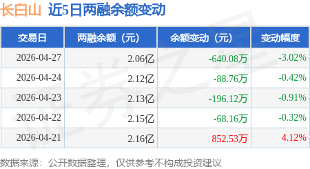 证券之星消息,4月27日,长白山(603099)融资买入1430.89万元,融资偿还2073.25万元,融资净卖出642.36万元,融资余额2.04亿元。