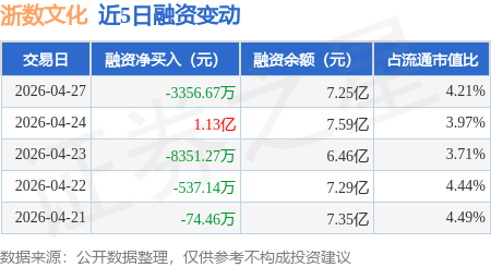 证券之星消息,4月27日,浙数文化(600633)融资买入2.24亿元,融资偿还2.58亿元,融资净卖出3356.67万元,融资余额7.25亿元。