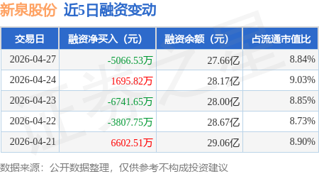 证券之星消息,4月27日,新泉股份(603179)融资买入8128.23万元,融资偿还1.32亿元,融资净卖出5066.53万元,融资余额27.66亿元,近20个交易日中有11个交易日出现融资净买入。