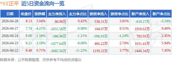 证券之星消息,截至2026年4月28日收盘,*ST正平(603843)报收于8.13元,上涨5.04%,换手率3.44%,成交量24.07万手,成交额1.91亿元。