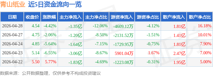 证券之星消息,截至2026年4月28日收盘,青山纸业(600103)报收于4.54元,下跌4.42%,换手率11.05%,成交量244.37万手,成交额11.19亿元。
