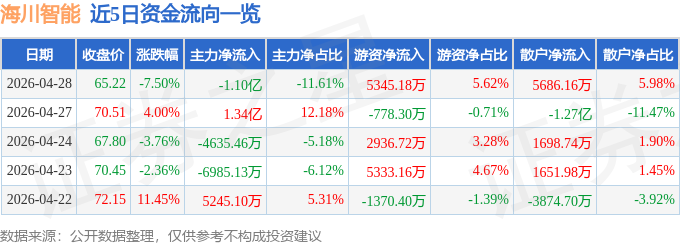 证券之星消息,截至2026年4月28日收盘,海川智能(300720)报收于65.22元,下跌7.5%,换手率8.13%,成交量14.2万手,成交额9.5亿元。