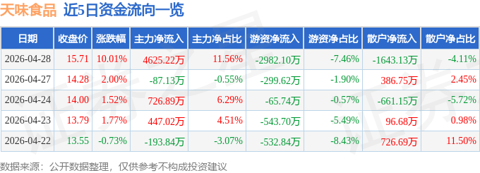 证券之星消息,天味食品4月28日涨停收盘,收盘价15.71元。该股于9点25分涨停,4次打开涨停,截止收盘封单资金为2443.97万元,占其流通市值0.15%。