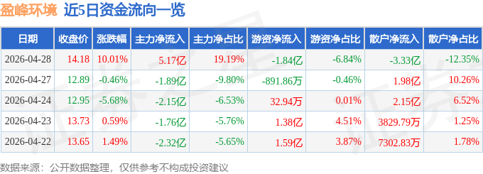 证券之星消息,盈峰环境4月28日涨停收盘,收盘价14.18元。该股于10点37分涨停,未打开涨停,截止收盘封单资金为1.84亿元,占其流通市值0.4%。
