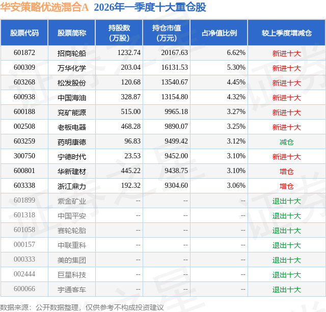 华安策略优选混合A的前十大重仓股如下: