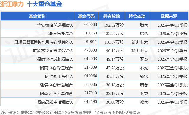 重仓浙江鼎力的前十大公募基金请见下表: