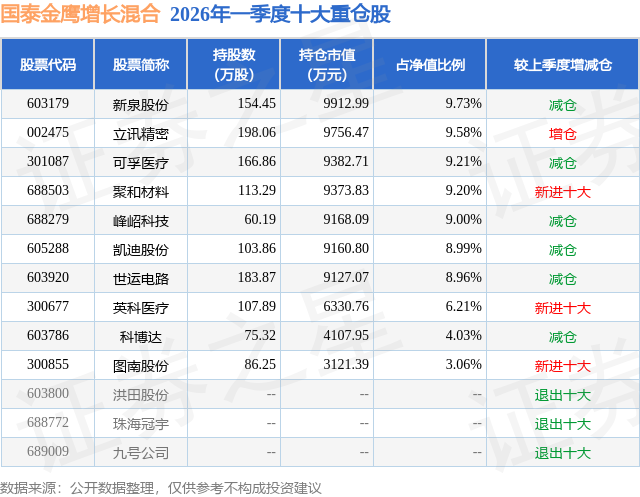 根据2026基金Q1季报公募基金重仓股数据,重仓该股的公募基金共35家,其中持有数量最多的公募基金为国泰基金的国泰金鹰增长混合。国泰金鹰增长混合目前规模为10.19亿元,最新净值1.5895(4月27日),较上一交易日上涨0.79%,近一年上涨52.47%。该公募基金现任基金经理为王兆祥。王兆祥在任的基金产品包括:国泰估值优势混合(LOF)A,管理时间为2022年6月21日至今,期间收益率为38.51%;国泰产业升级混合发起A,管理时间为2025年12月25日至今,期间收益率为9.2%;国泰研究精选两年持有混合,管理时间为2026年4月8日至今,期间收益率为8.81%;