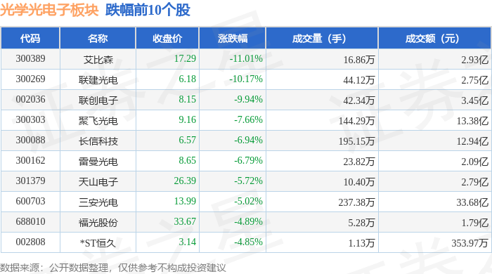 证券之星消息,4月28日光学光电子板块较上一交易日下跌2.12%,艾比森领跌。当日上证指数报收于4078.64,下跌0.19%。深证成指报收于14830.45,下跌1.1%。光学光电子板块个股涨跌见下表: