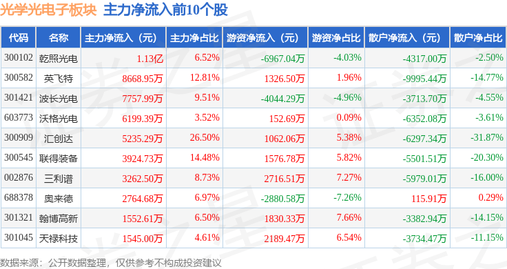 从资金流向上来看,当日光学光电子板块主力资金净流出33.27亿元,游资资金净流入4.93亿元,散户资金净流入28.34亿元。光学光电子板块个股资金流向见下表: