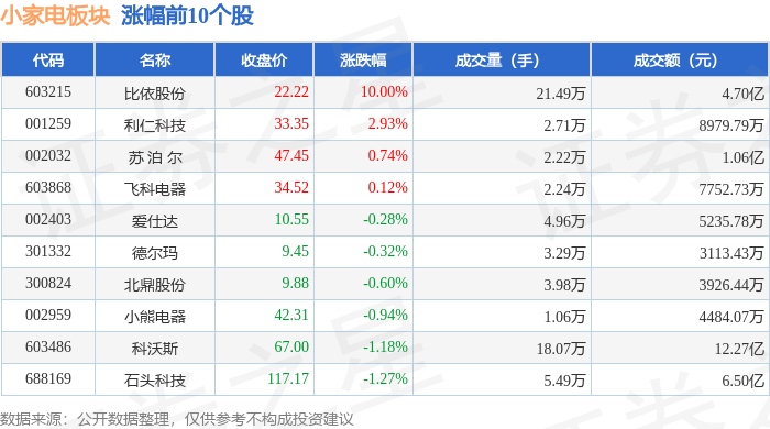 证券之星消息,4月28日小家电板块较上一交易日下跌1.34%,彩虹集团领跌。当日上证指数报收于4078.64,下跌0.19%。深证成指报收于14830.45,下跌1.1%。小家电板块个股涨跌见下表: