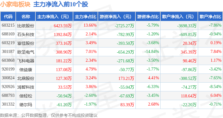 从资金流向上来看,当日小家电板块主力资金净流出1.54亿元,游资资金净流出1.16亿元,散户资金净流入2.7亿元。小家电板块个股资金流向见下表: