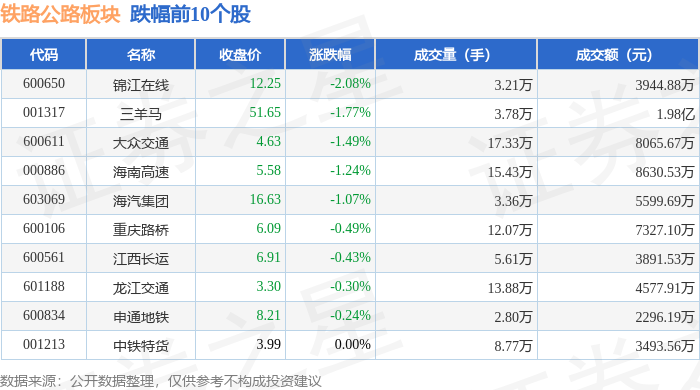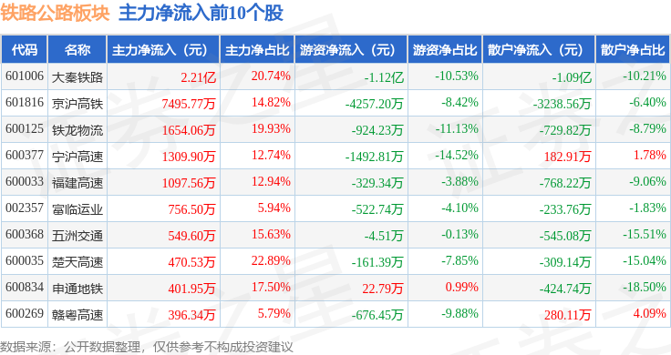 从资金流向上来看,当日铁路公路板块主力资金净流入2.94亿元,游资资金净流出2.07亿元,散户资金净流出8787.85万元。铁路公路板块个股资金流向见下表: