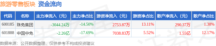 从资金流向上来看,当日旅游零售板块主力资金净流出2.56亿元,游资资金净流入9792.7万元,散户资金净流入1.58亿元。旅游零售板块个股资金流向见下表: