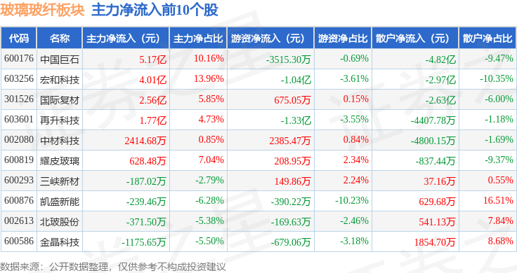 从资金流向上来看,当日玻璃玻纤板块主力资金净流入10.62亿元,游资资金净流出1.28亿元,散户资金净流出9.33亿元。玻璃玻纤板块个股资金流向见下表: