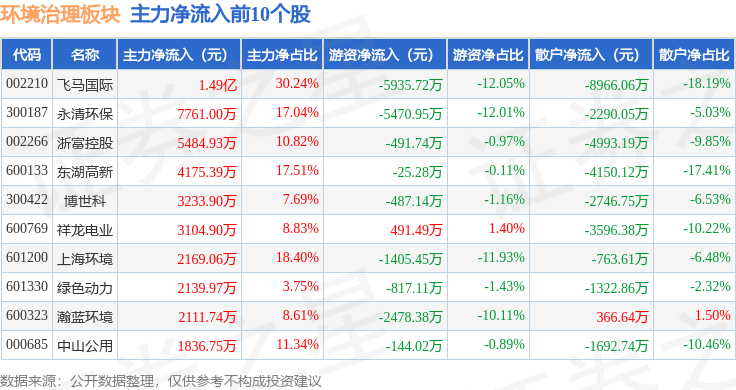 从资金流向上来看,当日环境治理板块主力资金净流出2.11亿元,游资资金净流出9120.78万元,散户资金净流入3.02亿元。环境治理板块个股资金流向见下表: