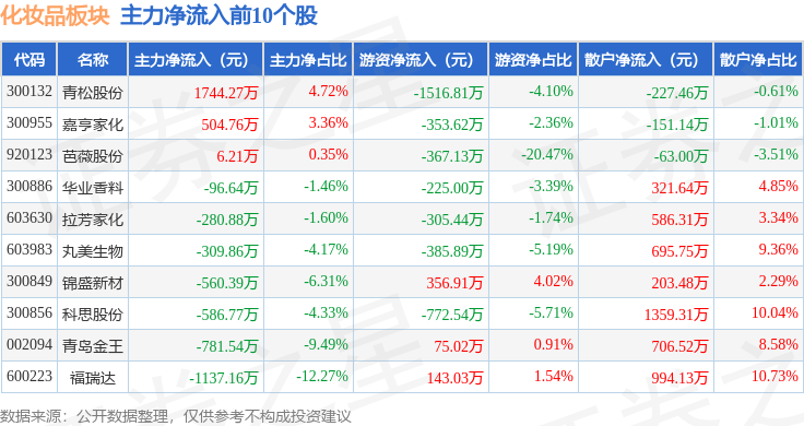 从资金流向上来看,当日化妆品板块主力资金净流出1.26亿元,游资资金净流出9457.87万元,散户资金净流入2.2亿元。化妆品板块个股资金流向见下表: