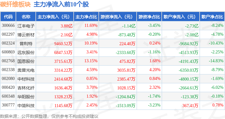 从资金流向上来看,当日碳纤维板块主力资金净流入1.25亿元,游资资金净流出2.57亿元,散户资金净流入1.32亿元。碳纤维板块个股资金流向见下表: