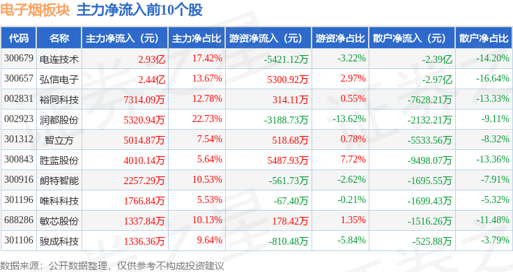从资金流向上来看,当日电子烟板块主力资金净流出32.55亿元,游资资金净流入11.84亿元,散户资金净流入20.71亿元。电子烟板块个股资金流向见下表:
