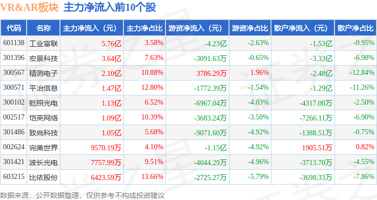 从资金流向上来看,当日VR&AR板块主力资金净流出94.24亿元,游资资金净流入12.53亿元,散户资金净流入81.71亿元。VR&AR板块个股资金流向见下表: