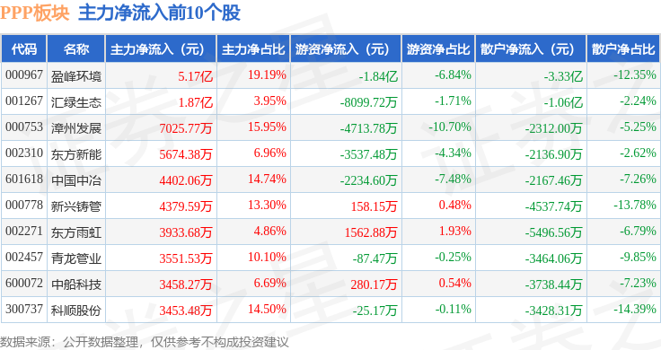 从资金流向上来看,当日PPP板块主力资金净流入1.35亿元,游资资金净流出1.58亿元,散户资金净流入2288.26万元。PPP板块个股资金流向见下表: