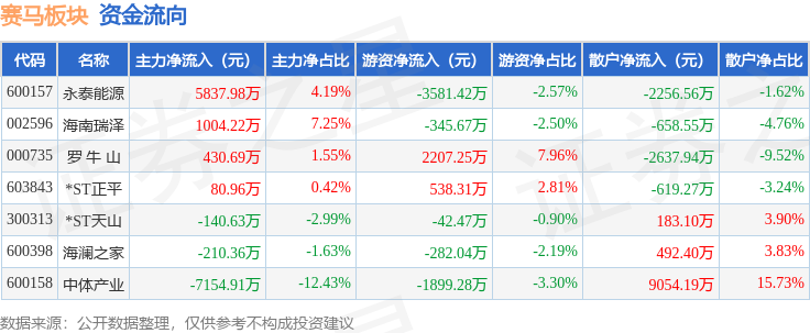 从资金流向上来看,当日赛马板块主力资金净流出152.06万元,游资资金净流出3405.33万元,散户资金净流入3557.38万元。赛马板块个股资金流向见下表: