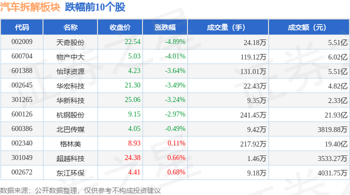 证券之星消息,4月28日汽车拆解板块较上一交易日下跌1.39%,天奇股份领跌。当日上证指数报收于4078.64,下跌0.19%。深证成指报收于14830.45,下跌1.1%。汽车拆解板块个股涨跌见下表: