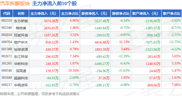 从资金流向上来看,当日汽车拆解板块主力资金净流出2.46亿元,游资资金净流入9341.02万元,散户资金净流入1.53亿元。汽车拆解板块个股资金流向见下表: